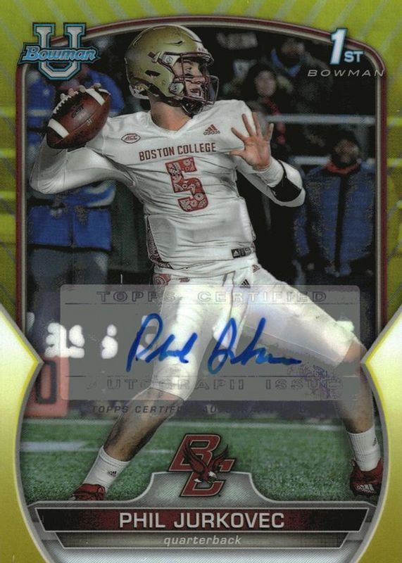 Best Prices Available For Sale of Phil Jurkovec 2022 Bowman Chrome University #35 Prospect Auto - Yellow Refractor /75 (1st)