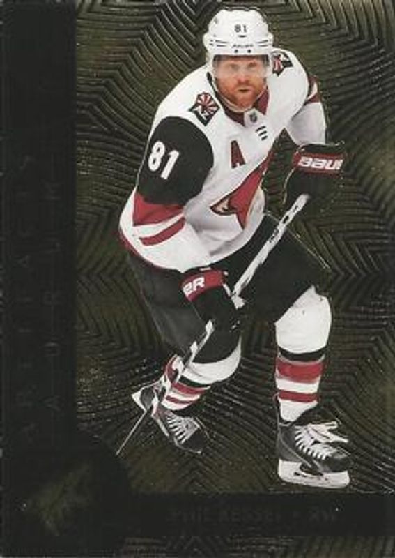 The Phil Kessel 2020 Upper Deck Artifacts #A-12 Aurum card is 1 of 18 Phil Kessel's card variations in the 2020 Upper Deck Artifacts set being tracked by Sports Card Investor, including Base /999, Blue Sapphire /499, Copper /299, Emerald /99, and Autumn /75.