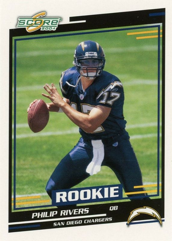The Philip Rivers 2004 Score #374 Base Rookie card in Raw condition has moved down -$2.00 (-50.0%) in the last 30 days and was last sold for $2.00 .