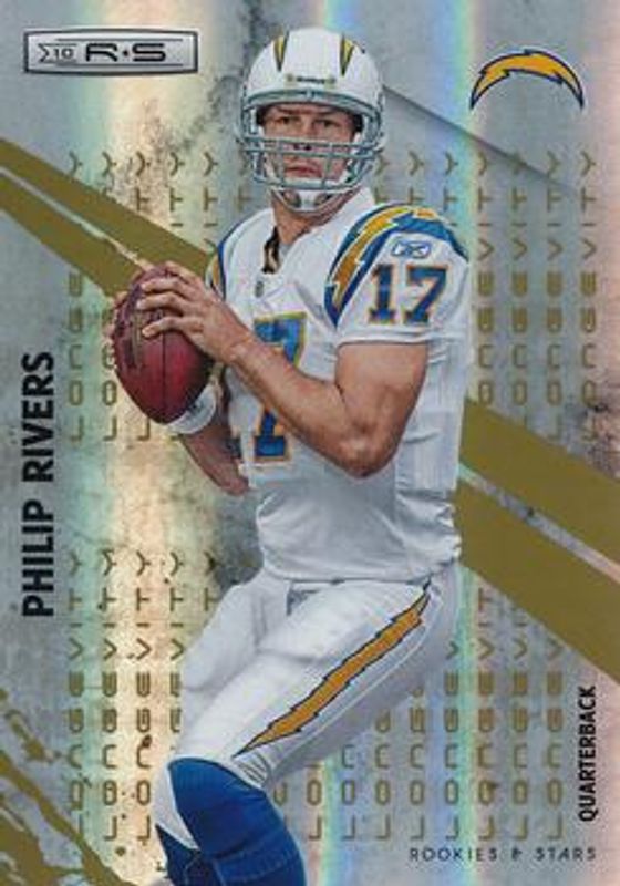 The Philip Rivers 2010 Rookies & Stars #122 Longevity Parallel Gold /49 card is 1 of 14 Philip Rivers' card variations in the 2010 Rookies & Stars set being tracked by Sports Card Investor, including Base /299, Gold, Longevity Parallel Silver /249, Longevity Parallel Silver Holofoil /99, and Longevity Parallel Platinum /25.