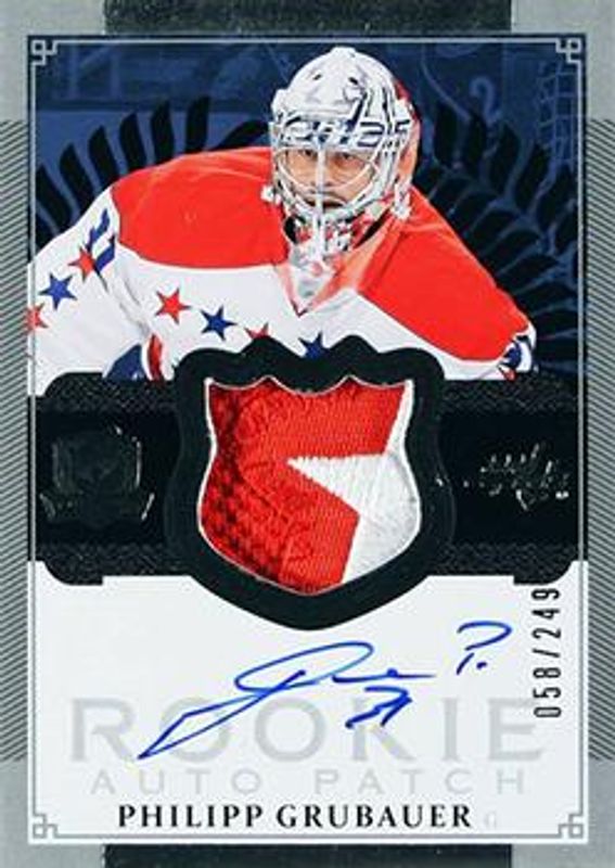 The Philipp Grubauer 2013 Upper Deck The Cup #124 Base /249 Rookie card is 1 of 18 Philipp Grubauer's card variations in the 2013 Upper Deck The Cup set being tracked by Sports Card Investor, including Gold Rookie Autographed Patch /58, Gold Rainbow /25, Gold /14, Black Laundry Tags /3, and Black Rookie Auto Tag /3.