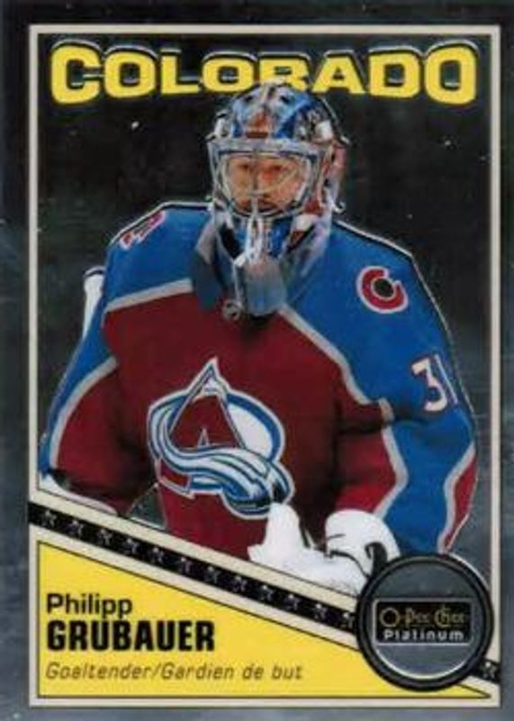 The Philipp Grubauer 2019 O-Pee-Chee Platinum #R-46 Retro card is 1 of 18 Philipp Grubauer's card variations in the 2019 O-Pee-Chee Platinum set being tracked by Sports Card Investor, including Base, Matte Pink, Rainbow, Sunset, and Violet Pixels /399.