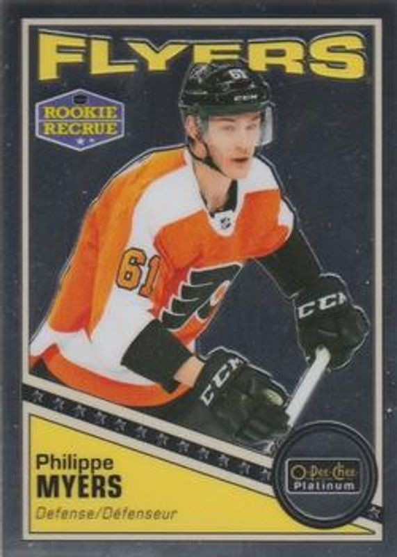 The Philippe Myers 2019 O-Pee-Chee Platinum #R-52 Retro Rookie card is 1 of 18 Philippe Myers' card variations in the 2019 O-Pee-Chee Platinum set being tracked by Sports Card Investor, including Base, Matte Pink, Rainbow, Sunset, and Violet Pixels /399.