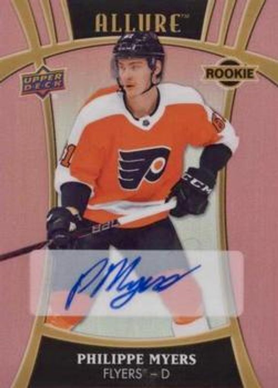 The Philippe Myers 2019 Upper Deck Allure #118 Pink Diamond Autographs /59 Rookie card is 1 of 42 Philippe Myers' card variations in the 2019 Upper Deck Allure set being tracked by Sports Card Investor, including #118 Base, #79 Base, #79 Pewter, #118 Pink Diamond, and #79 Red Rainbow.