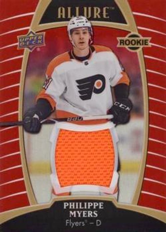 The Philippe Myers 2019 Upper Deck Allure #79 Red Rainbow Jersey Relics Rookie card is 1 of 42 Philippe Myers' card variations in the 2019 Upper Deck Allure set being tracked by Sports Card Investor, including #118 Base, #79 Base, #79 Pewter, #118 Pink Diamond, and #79 Red Rainbow.
