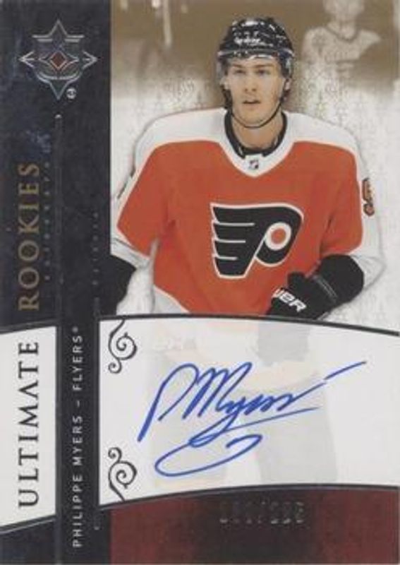 The Philippe Myers 2020 Upper Deck Ultimate Collection #RRA-PM 2019 Upper Deck Ultimate Collection Update: Retro Ultimate Rookies Autographed /225 card is 1 of 11 Philippe Myers' card variations in the 2020 Upper Deck Ultimate Collection set being tracked by Sports Card Investor, including #UI-8 2019 Upper Deck Ultimate Collection Update I: Ultimate Introductions Gold Autographs, #UI-8 2019 Upper Deck Ultimate Collection Update /299, #172 2019 Upper Deck Ultimate Collection Update /299, #172 2019 Upper Deck Ultimate Collection Update I /299, and #DT-PM 2019 Upper Deck Ultimate Collection Update: Autographed Debut Threads /99.