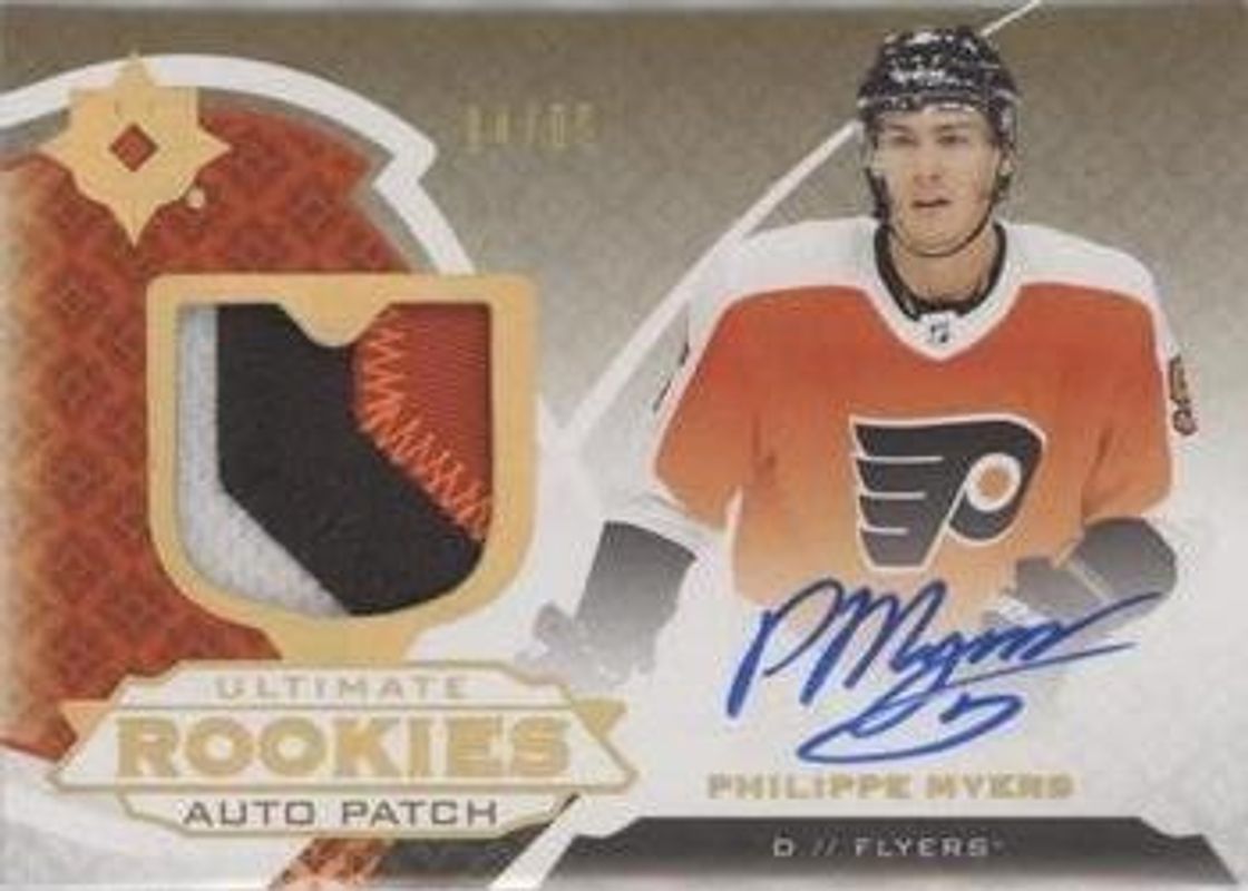 The Philippe Myers 2020 Upper Deck Ultimate Collection #172 2019 Upper Deck Ultimate Collection Update: Ultimate Rookies Auto Patch /99 card is 1 of 11 Philippe Myers' card variations in the 2020 Upper Deck Ultimate Collection set being tracked by Sports Card Investor, including #UI-8 2019 Upper Deck Ultimate Collection Update I: Ultimate Introductions Gold Autographs, #UI-8 2019 Upper Deck Ultimate Collection Update /299, #172 2019 Upper Deck Ultimate Collection Update /299, #172 2019 Upper Deck Ultimate Collection Update I /299, and #RRA-PM 2019 Upper Deck Ultimate Collection Update: Retro Ultimate Rookies Autographed /225.