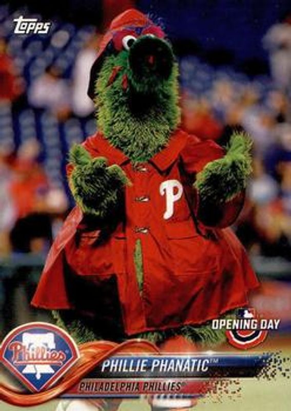 The Phillie Phanatic 2018 Topps Opening Day #M-18 Mascots card is 1 of 3 Phillie Phanatic's card variations in the 2018 Topps Opening Day set being tracked by Sports Card Investor, including Mascots - 5x7 /49, and Mascots - 5x7 Gold /10.