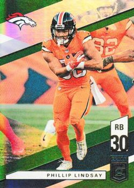 The Phillip Lindsay 2019 Elite #61 Green card is 1 of 18 Phillip Lindsay's card variations in the 2019 Elite set being tracked by Sports Card Investor, including Red /299, Purple /99, Orange /49, Aspirations Die-Cut /24, and Status Die-Cut /24.