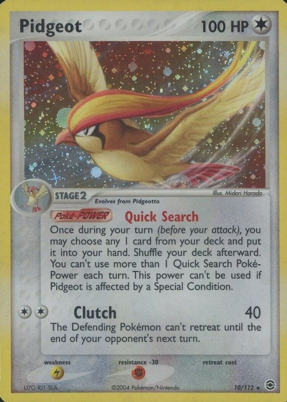The Pidgeot 2004 EX: FireRed & LeafGreen #010/112 Holo card in Raw TCG (Near Mint) condition has moved up $13.99 (+233%) in the last 30 days and was last sold for $19.99 .