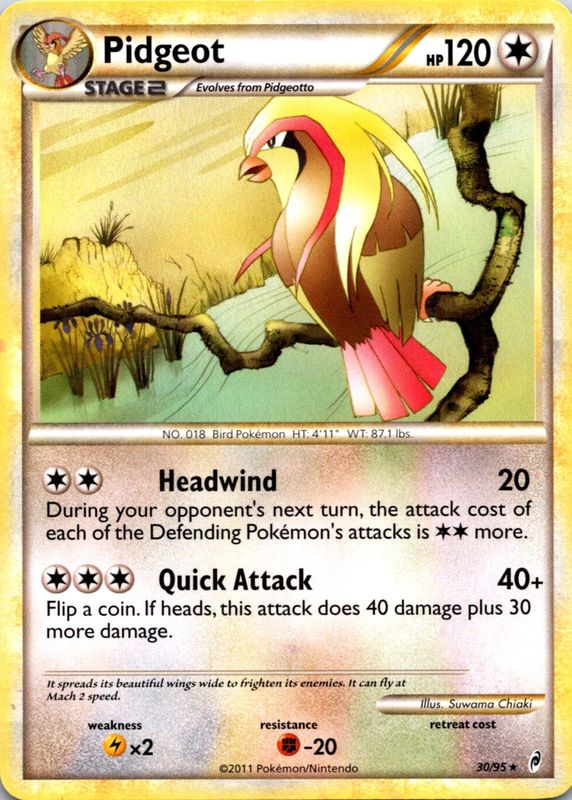 The Pidgeot 2011 Call of Legends #30/95 Base card in Raw TCG (Near Mint) condition has moved down -$0.94 (-15.9%) in the last 30 days and was last sold for $4.99 .