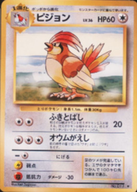 The Pidgeotto 1996 Japanese Base Set #17 Base card in Raw TCG (Near Mint) condition has not changed in price in the last 30 days and was last sold for $9.99 .