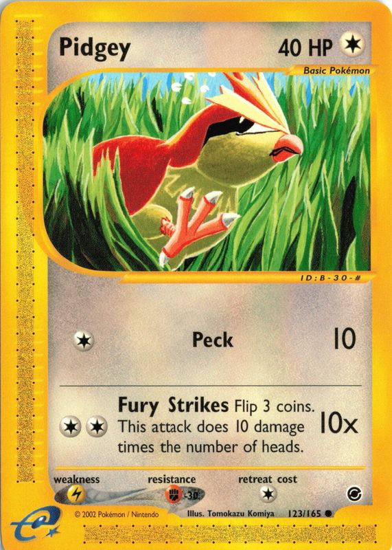 The Pidgey 2002 Expedition #123/165 Base card in Raw TCG (Near Mint) condition has moved up $0.88 (+17.2%) in the last 30 days and was last sold for $6.00 .