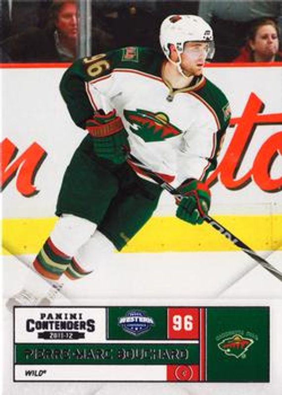 The Pierre-Marc Bouchard 2011 Contenders #96 Base /800 card is 1 of 7 Pierre-Marc Bouchard's card variations in the 2011 Contenders set being tracked by Sports Card Investor, including Gold /100, Black /1, Printing Plate Black /1, Printing Plate Cyan /1, and Printing Plate Magenta /1.