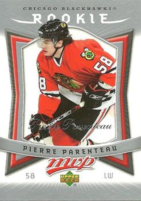 The Pierre Parenteau 2007 Upper Deck MVP #303 Base Rookie card is 1 of 3 Pierre Parenteau's card variations in the 2007 Upper Deck MVP set being tracked by Sports Card Investor, including Gold Scripts /100, and Super Scripts /25.