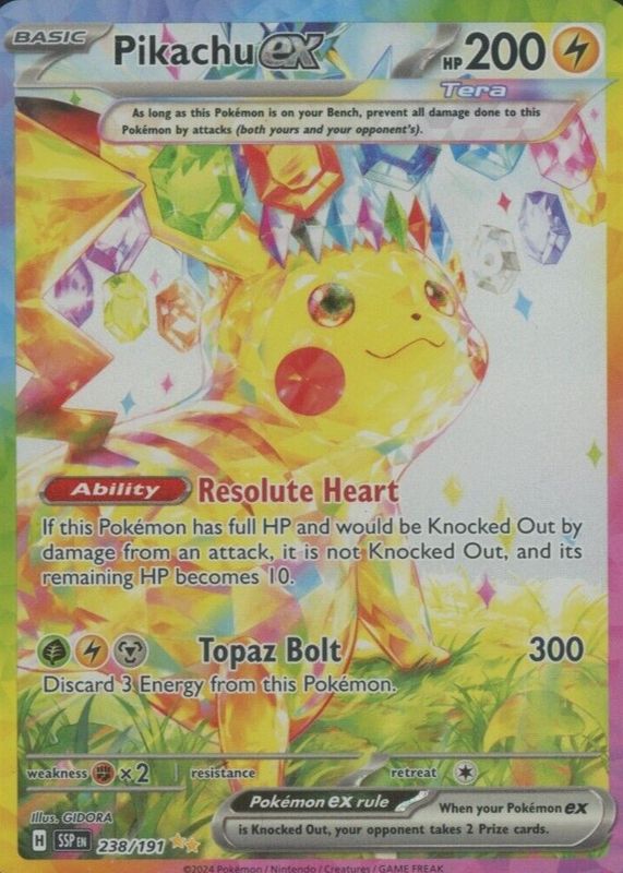 The Pikachu ex 2024 Scarlet & Violet: Surging Sparks #238/191 Special Illustration Rare card in Raw TCG (Lightly Played) condition has moved down -$14.60 (-5.5%) in the last 30 days and was last sold for $250.00 .
