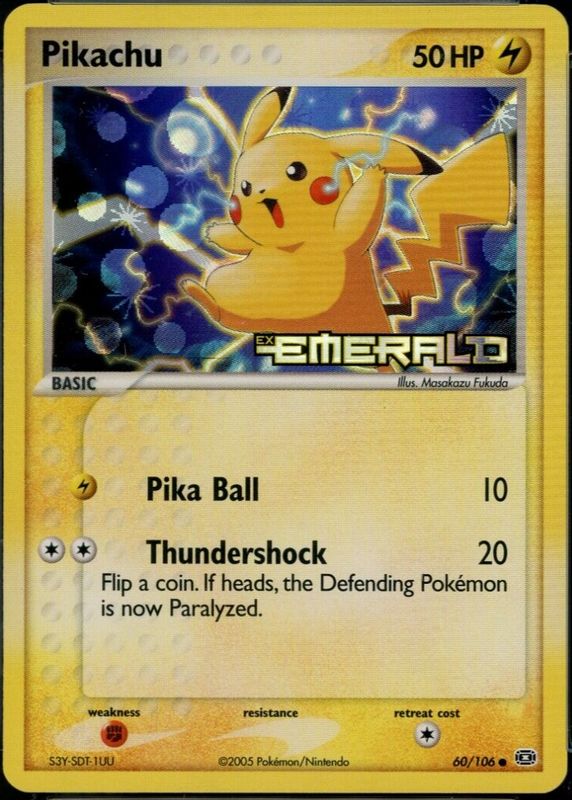 The Pikachu 2005 EX: Emerald #60 Reverse Holo card in Raw TCG (Near Mint) condition has not changed in price in the last 30 days and was last sold for $190.00 .