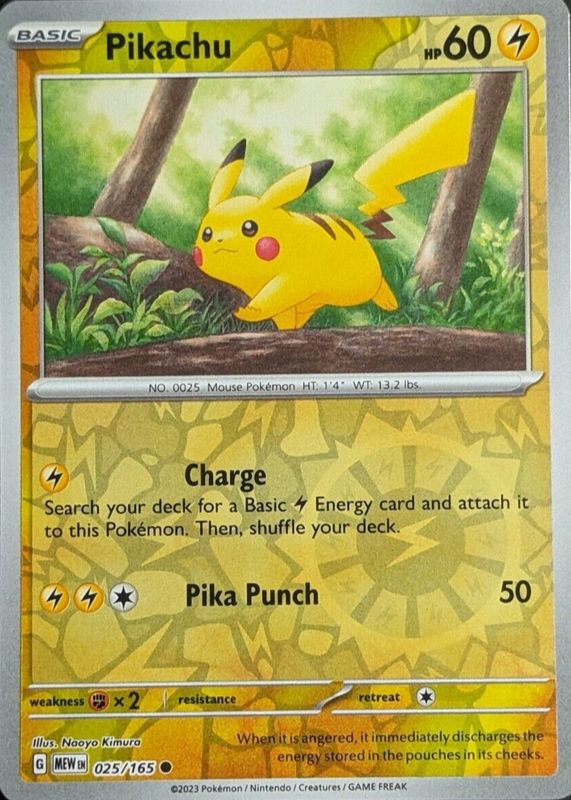 The Pikachu 2023 Scarlet & Violet: 151 #025/165 Reverse Holo card in Raw TCG (Near Mint) condition has moved down -$1.24 (-32.0%) in the last 30 days and was last sold for $2.63 .