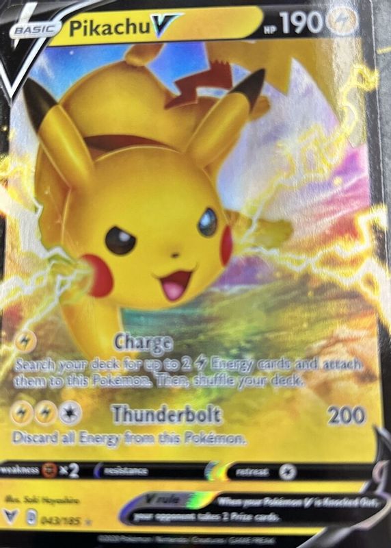 The Pikachu V 2020 Sword & Shield: Vivid Voltage #043/185 Base card in Raw TCG (Near Mint) condition has moved up $6.08 (+182%) in the last 30 days and was last sold for $9.42 .