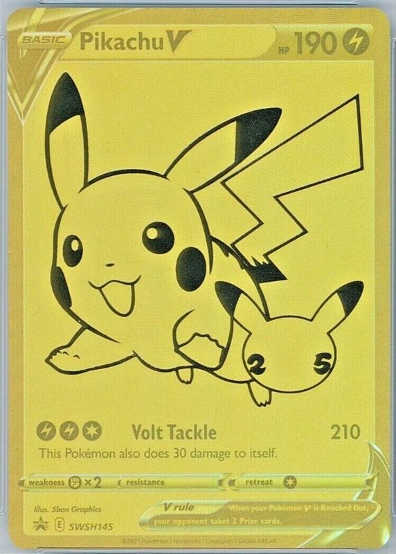 The Pikachu V 2021 Sword & Shield: Black Star Promo #SWSH145 Celebrations Ultra-Premium Collection (Full Art) card in Raw TCG (Near Mint) condition has moved up $2.01 (+3.4%) in the last 30 days and was last sold for $62.00 .