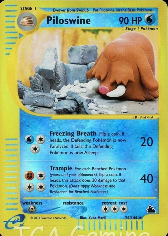 The Piloswine 2003 Skyridge #024/144 Reverse Holo card in Raw TCG (Near Mint) condition has not changed in price in the last 30 days and was last sold for $114.00 .