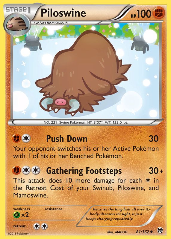 The Piloswine 2015 XY: BREAKthrough #081/162 Base card in Raw TCG (Lightly Played) condition has moved up $0.62 (+62.6%) in the last 30 days and was last sold for $1.61 .