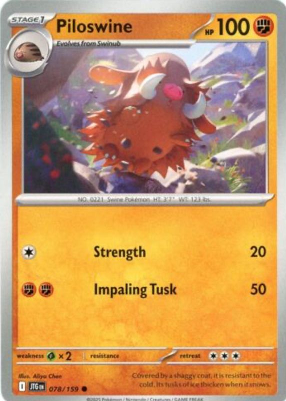 The Piloswine 2025 Scarlet & Violet: Journey Together #078/159 Base card in Raw TCG (Near Mint) condition has not changed in price in the last 30 days and was last sold for $1.55 .