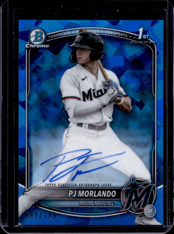 The PJ Morlando 2025 Bowman Sapphire Edition #CPS-PM Chrome Prospect Autographs /199 card is 1 of 21 PJ Morlando's card variations in the 2025 Bowman Sapphire Edition set being tracked by Sports Card Investor, including Chrome Prospects, Sapphire Selections, Chrome Prospect Autographs - Green Refractor /99, Chrome Prospects - Green Refractor /99, and Chrome Prospects - Yellow Refractor /75.