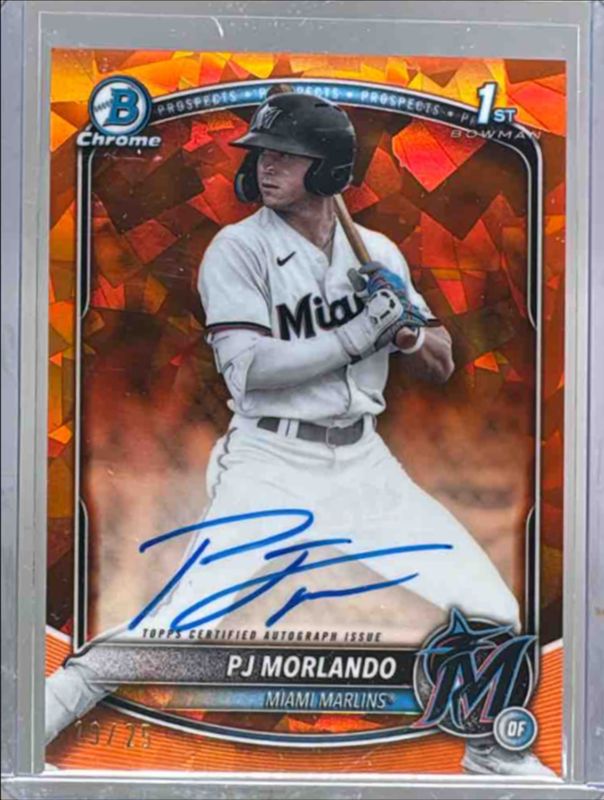 The PJ Morlando 2025 Bowman Sapphire Edition #CPS-PM Chrome Prospect Autographs - Orange Refractor /25 card is 1 of 21 PJ Morlando's card variations in the 2025 Bowman Sapphire Edition set being tracked by Sports Card Investor, including Chrome Prospects, Sapphire Selections, Chrome Prospect Autographs /199, Chrome Prospect Autographs - Green Refractor /99, and Chrome Prospects - Green Refractor /99.