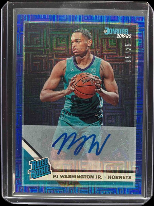 The PJ Washington Jr. 2019 Donruss #211 Rated Rookies Signatures - Blue Infinite /35 card is 1 of 50 PJ Washington Jr.'s card variations in the 2019 Donruss set being tracked by Sports Card Investor, including Base, Green Flood, Green & Yellow Laser, Infinite, and Orange Laser.