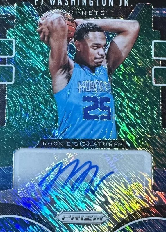 The PJ Washington Jr. 2019 Prizm #RS-PJW Rookie Signatures - FOTL Green Shimmer /25 card in Raw condition has not changed in price in the last 30 days and was last sold for $17.54 .