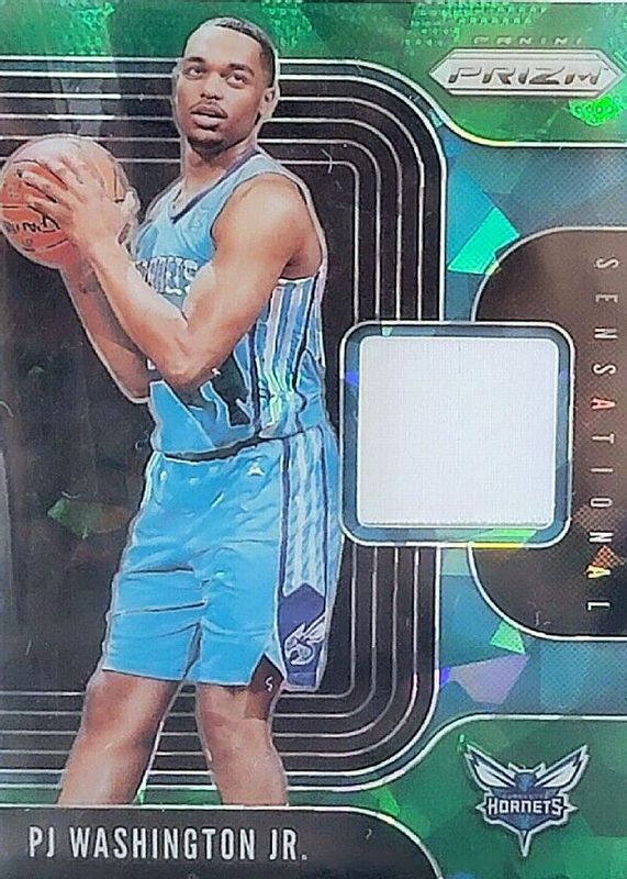 The PJ Washington Jr. 2019 Prizm #SS-PJW Sensational Swatches - Green Ice /56 Rookie card in Raw condition has not changed in price in the last 30 days and was last sold for $1.25 .