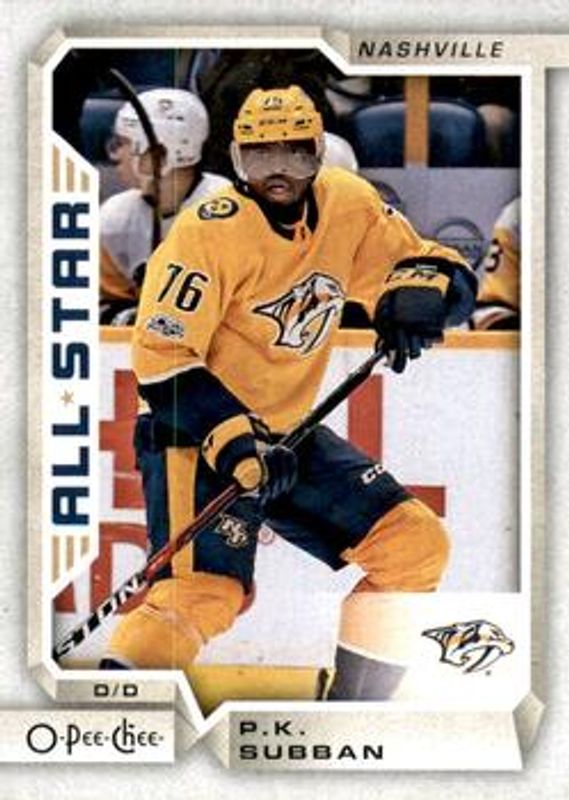 PK Subban's Hockey cards are available in at least 194 sets. PK Subban's biggest 7-day price movers are 2018 O-Pee-Chee #23 Base, 2017 Upper Deck Compendium #445 Printing Plates Magenta /1, and 2017 Upper Deck Compendium #445 Printing Plates Yellow /1.