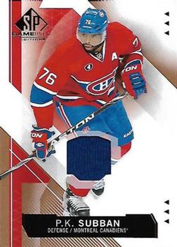 PK Subban's Hockey cards are available in at least 131 sets. PK Subban's biggest 7-day price movers are 2015 SP Game Used #18 Copper Jersey /399, 2015 SP Game Used #GG-PS NHL Stars Game Gear /3, and 2010 SP Game Used #SN-PS SIGnificant Numbers Autographs /11.