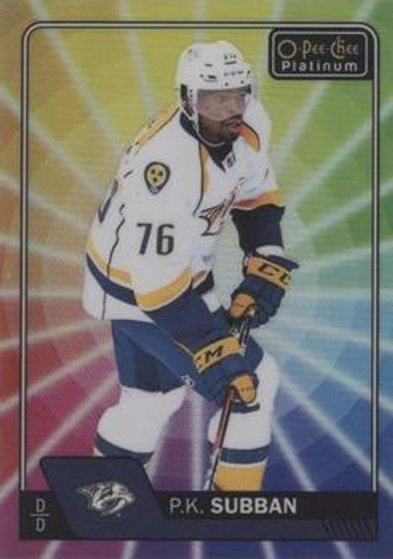 The PK Subban 2016 O-Pee-Chee Platinum #60 Rainbow Color Wheel card is 1 of 14 PK Subban's card variations in the 2016 O-Pee-Chee Platinum set being tracked by Sports Card Investor, including Base, Ice Blue Traxx, Rainbow, Red Prism /199, and Royal Blue Cubes /99.