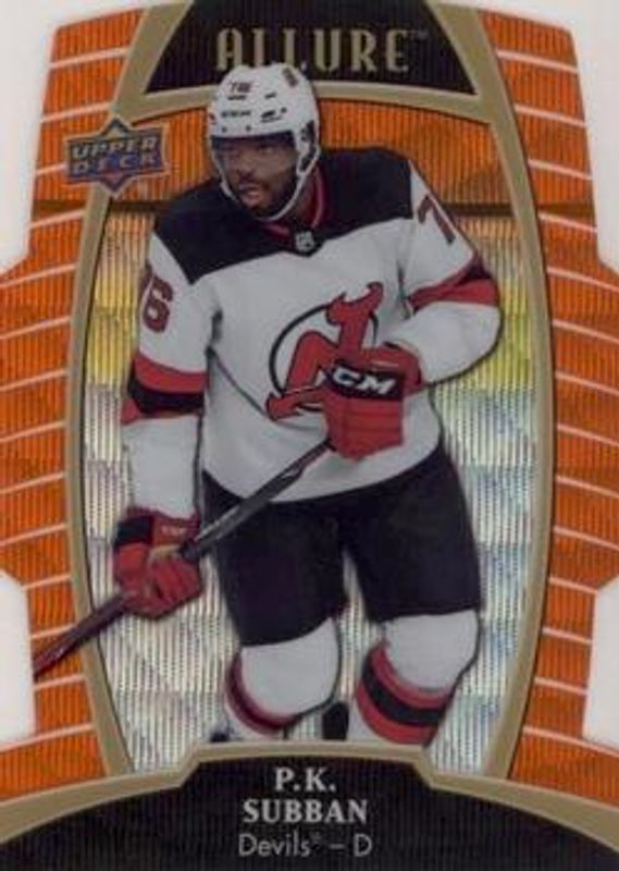 The PK Subban 2019 Upper Deck Allure #53 Orange Slice /199 card is 1 of 16 PK Subban's card variations in the 2019 Upper Deck Allure set being tracked by Sports Card Investor, including Base, Pewter, Red Rainbow, White Rainbow, and Yellow Taxi.
