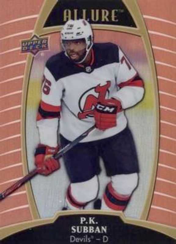 The PK Subban 2019 Upper Deck Allure #53 Sunset card is 1 of 16 PK Subban's card variations in the 2019 Upper Deck Allure set being tracked by Sports Card Investor, including Base, Pewter, Red Rainbow, White Rainbow, and Yellow Taxi.