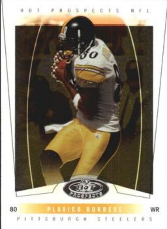 The Plaxico Burress 2004 Fleer Hot Prospects #18 Base /350 card is 1 of 3 Plaxico Burress' card variations in the 2004 Fleer Hot Prospects set being tracked by Sports Card Investor, including Red Hot /50, and White Hot /1.
