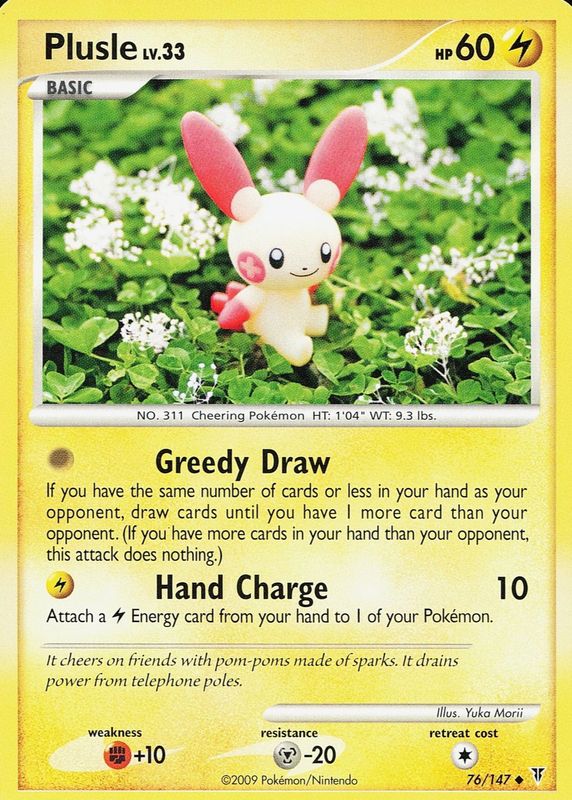 The Plusle 2009 Platinum: Supreme Victors #076/147 Base card in Raw TCG (Near Mint) condition has moved up $9.49 (+173%) in the last 30 days and was last sold for $14.99 .