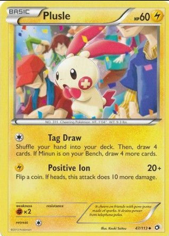 The Plusle 2013 Black & White: Legendary Treasures #047/113 Base card in Raw TCG (Near Mint) condition has moved up $0.84 (+30.5%) in the last 30 days and was last sold for $3.59 .