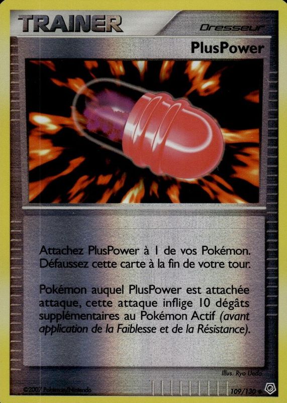 The PlusPower 2007 Diamond & Pearl #109/130 Reverse Holo card in Raw TCG (Near Mint) condition has not changed in price in the last 30 days and was last sold for $1.00 .