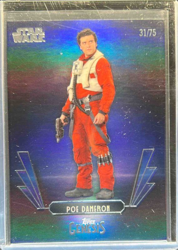 The Poe Dameron 2025 Topps Disney Genesis #12 Blue Foil /75 card is 1 of 8 Poe Dameron's card variations in the 2025 Topps Disney Genesis set being tracked by Sports Card Investor, including Base /99, Gold Foil /50, Orange Foil /25, Purple Foil /15, and Black Shimmer /10.
