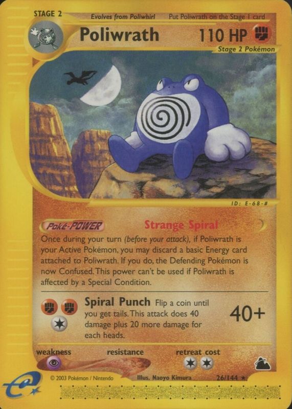 The Poliwrath 2003 Skyridge #026/144 Base card in Raw TCG (Near Mint) condition has not changed in price in the last 30 days and was last sold for $38.92 .