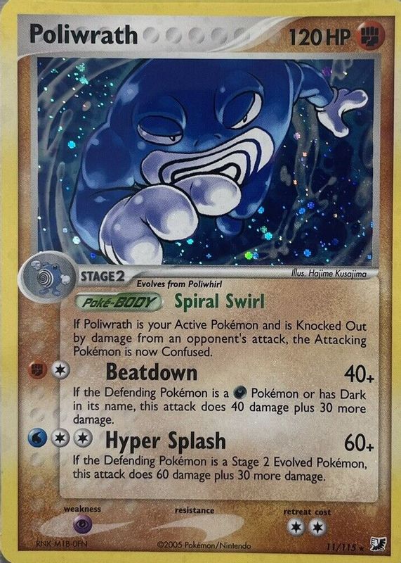 The Poliwrath 2005 EX: Unseen Forces #011/115 Holo card in Raw TCG (Near Mint) condition has moved down -$10.59 (-33.1%) in the last 30 days and was last sold for $21.40 .