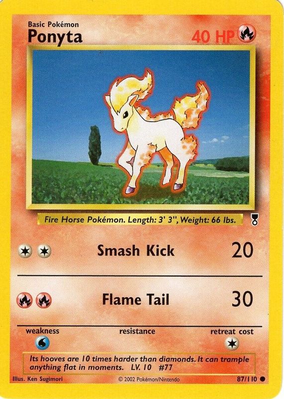 The Ponyta 2002 Legendary Collection #87 Base card in Raw TCG (Near Mint) condition has moved up $2.46 (+121%) in the last 30 days and was last sold for $4.49 .