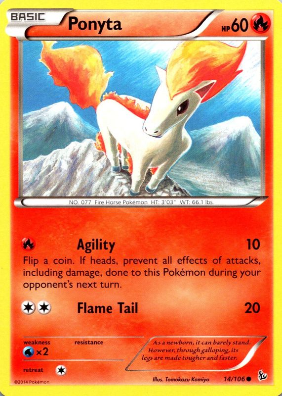 The Ponyta 2014 XY: Flashfire #014/106 Base card in Raw TCG (Lightly Played) condition has moved up $1.25 (+126%) in the last 30 days and was last sold for $2.24 .