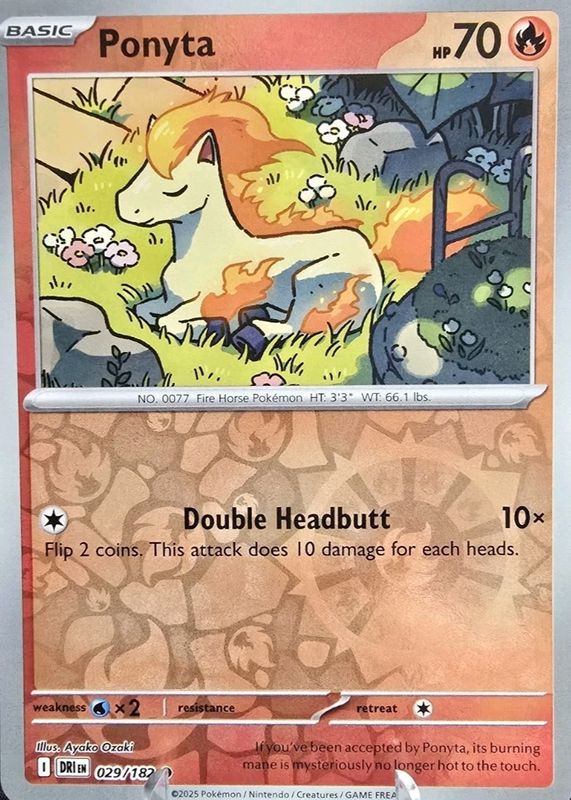 The Ponyta 2025 Scarlet & Violet: Destined Rivals #029/182 Reverse Holo card in Raw TCG (Near Mint) condition has not changed in price in the last 30 days and was last sold for $1.09 .