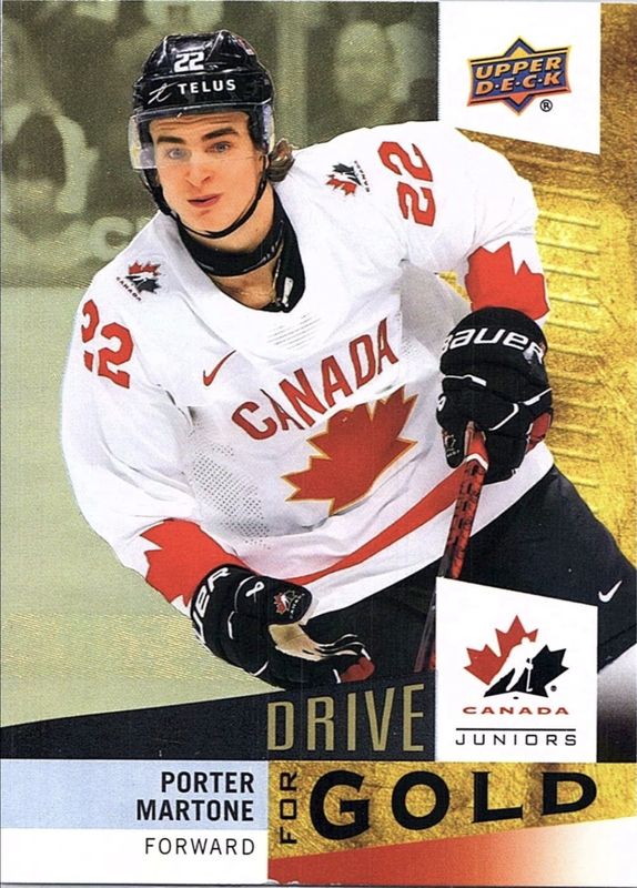 The Porter Martone 2025 Upper Deck Team Canada Juniors #DG-25 Drive for Gold card is 1 of 57 Porter Martone's card variations in the 2025 Upper Deck Team Canada Juniors set being tracked by Sports Card Investor, including Base, Blue Patterned Foilboard, Clear Cut, Jersey, and Outburst.