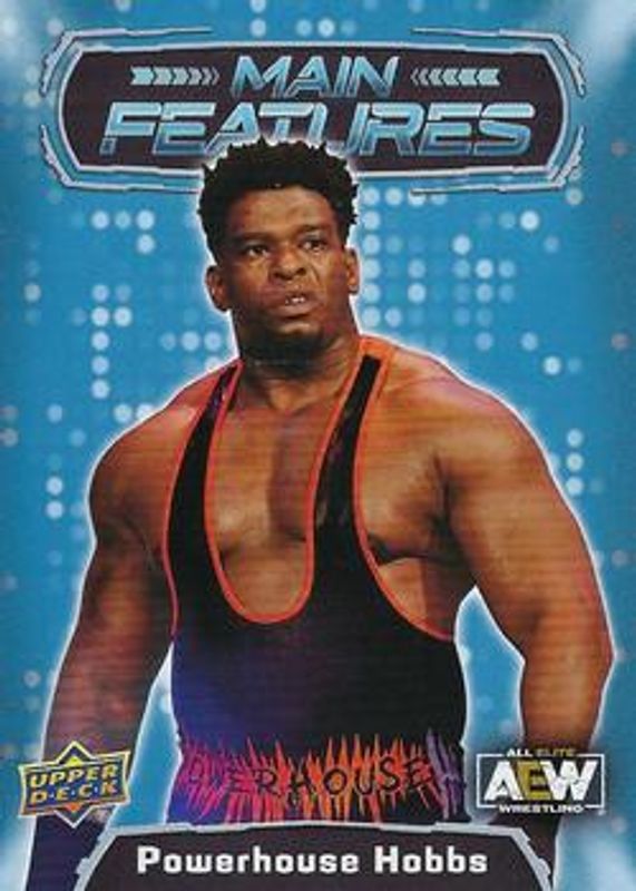 The Powerhouse Hobbs 2022 Upper Deck AEW #MF-21 Main Features card is 1 of 39 Powerhouse Hobbs' card variations in the 2022 Upper Deck AEW set being tracked by Sports Card Investor, including Base, Gold, Pyro, Silver Foil, and Green Pyro /399.