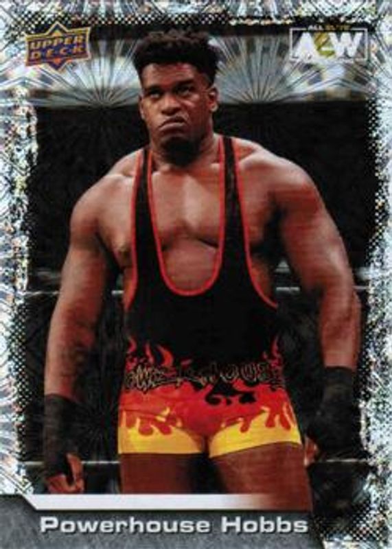 The Powerhouse Hobbs 2022 Upper Deck AEW #6 Pyro card is 1 of 39 Powerhouse Hobbs' card variations in the 2022 Upper Deck AEW set being tracked by Sports Card Investor, including Base, Gold, Silver Foil, Green Pyro /399, and Dynamite /299.